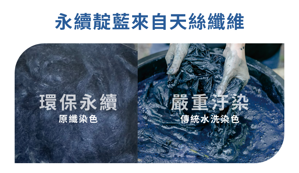 鎖進纖維中,讓每一條紗線都擁有穩定不易褪的靛藍色,在過程中大量減少用水與二氧