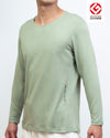 33°C感溫衣 則是「雙向調溫」,核心在於德國專利 PCM 植萃纖維(源自油麻菜籽油)。這種材料能在 33°C 舒適區間主動「吸熱」和「放熱」,將體溫維持在恆定狀態,解決忽冷忽熱的困擾。