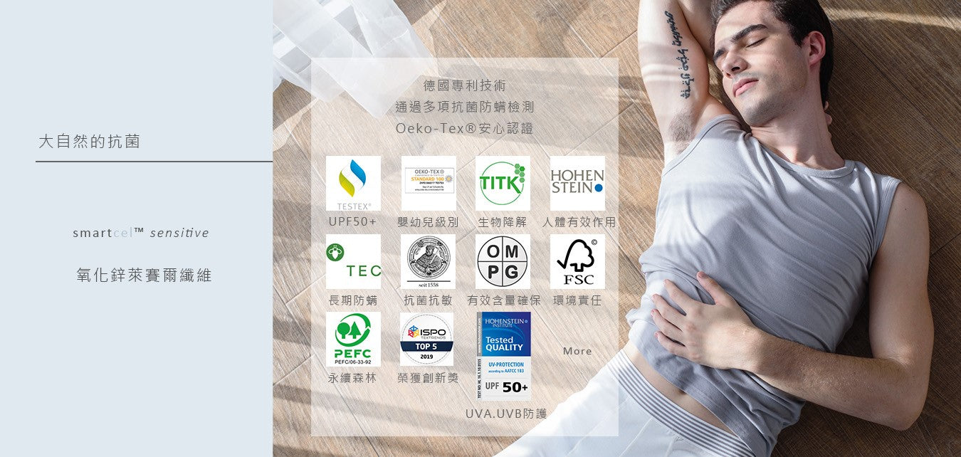 84%天絲™萊賽爾TENCEL® 10%氧化鋅萊賽爾smartcel™ sensitive6%彈性纖維Spandex